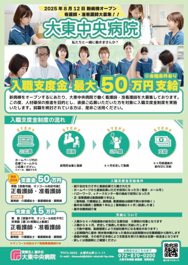 大東中央病院では、2025年8月12日に新病棟をオープンするにあたり、看護師・准看護師を大募集しております。この度、人材確保の推進を目的とし、直接ご応募いただいた方を対象に入職支度金制度を実施いたします。